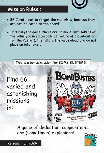 새로운 숫자 카드 3장을 오픈하고 순서 카드를 놓는다. 2분 시간을 준다. 전선 4개를 잘라야 다음 숫자를 자를 수 있다. (#16번 미션과 비슷) 플레이어 턴에 숫자가 없으면 패스할 수 있다.